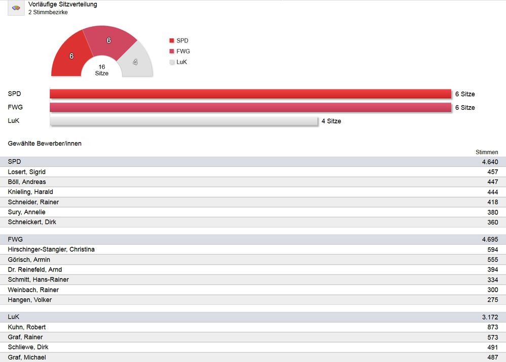 FWG 6 Sitze, SPD 6 Sitze, LuK 4 Sitze
